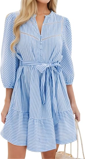 Women Striped Shirts Dress: Casual V Neck Button Down 3/4 Sleeve Belted Ruffle Flowy Midi Dress with Pockets