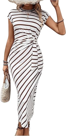 Women's Striped Dress Tie Side Cap Sleeve Round Neck Bodycon Pencil Summer Long Dresses