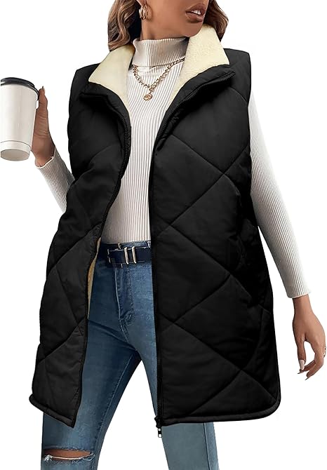 Womens 2024 Reversible Vest Sleeveless Fleece Jacket Double Zip Up Long Warm Winter Coat Outerwear with Pockets